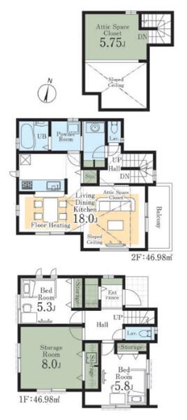 | 間取詳細 | LDK18帖 2階 1部屋 , 洋室5.8帖 1階 1部屋 , 洋室5.3帖 1階 1部屋 , S8帖 1階 1部屋 | ||