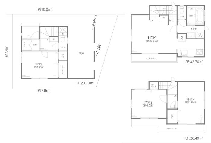 | 間取詳細 | LDK14.4帖 2階 1部屋 , 洋室6.7帖 3階 1部屋 , 洋室6帖 3階 1部屋 , 洋室5.5帖 1階 1部屋 | ||