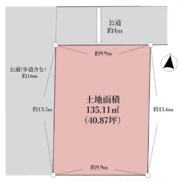 | 接道状況 | 二方 西 公道16m(間口13.5m) 北 公道4m(間口9.9m) | ||