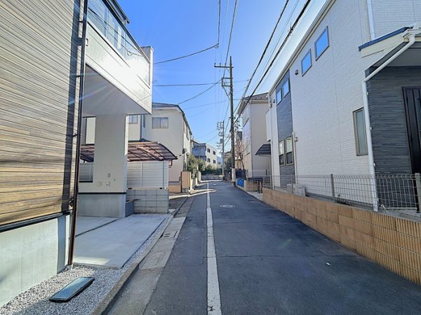 公道と法定外道路接道で、角地風に建つ新築戸建て。